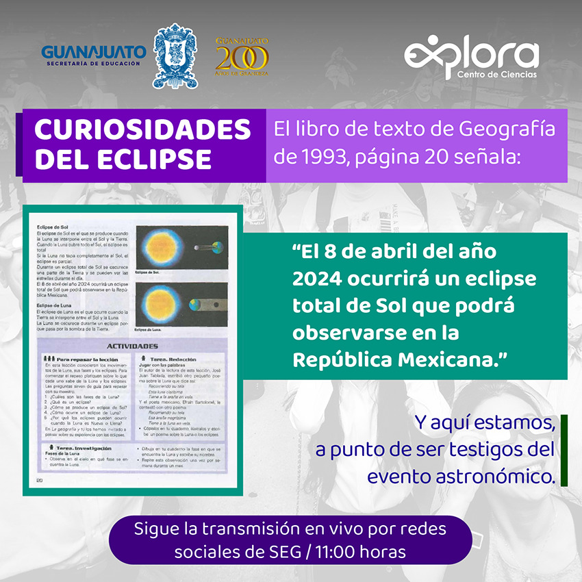 Guanajuato, Gto.- Porque cada evento es una oportunidad para aprender, la Secretaría de Educación de Guanajuato (SEG) informa a la comunidad educativa y al público en general, sobre las actividades didácticas planificadas en relación con el próximo eclipse solar que ocurrirá el lunes 8 de abril.
