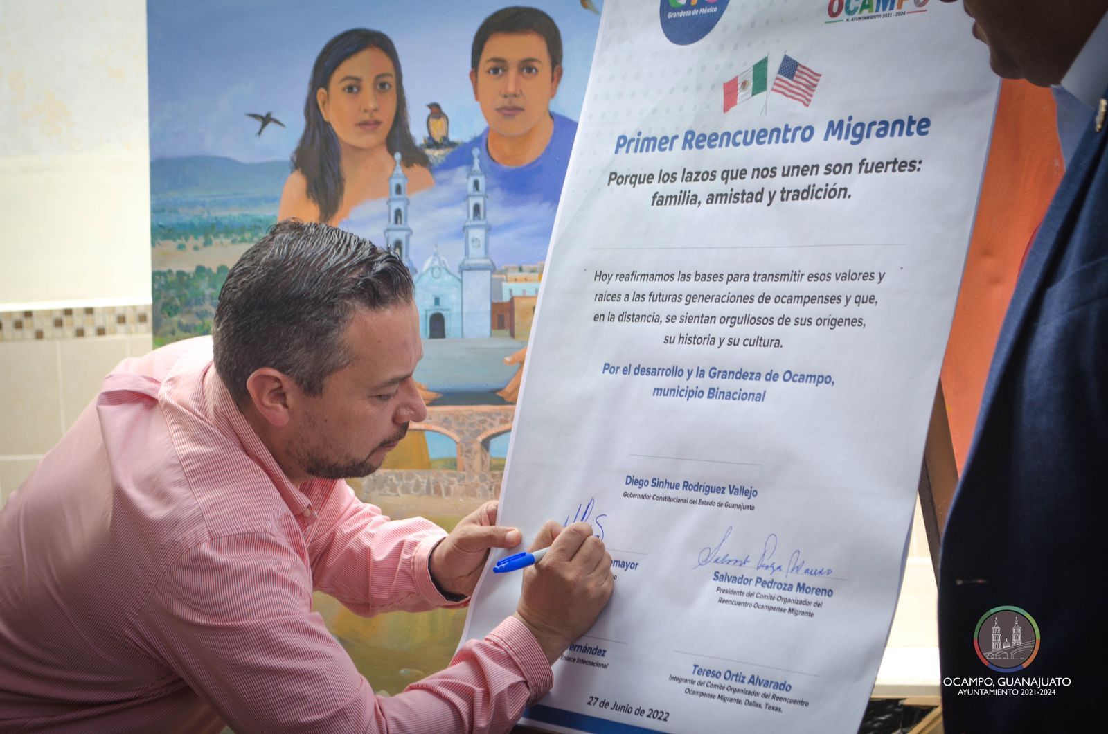 Y firmaron el Gobernador de Guanajuato, Diego Sinhue Rodríguez Vallejo; el Secretario del Migrante y Enlace Internacional, John Robert Hernández; el Presidente Municipal de Ocampo, Érick Silvano Montemayor Lara; el Presidente de la Fundación Reencuentro del Migrante, Salvador Pedroza Moreno y Tereso Ortiz Alvarado, Integrante de la Fundación.