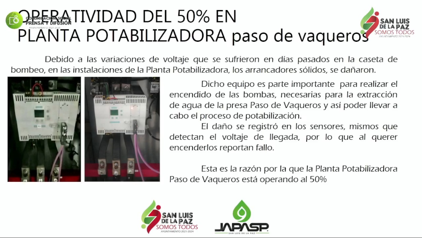 Luego de que desde inicios de la semana pasada se registraran un problema severo de desabasto de agua en la mancha urbana del municipio, el alcalde, Luis Gerardo Sánchez Sánchez, anunció a la población las causas y soluciones que la Junta de Agua Potable y Alcantarillado de San Luis de la Paz (Japasp) implementará en la Plata Tratadora de la Presa Paso de Vaqueros. Mientras el servicio se alista se estará enviando el vital líquido a las colonias mediante pipas.